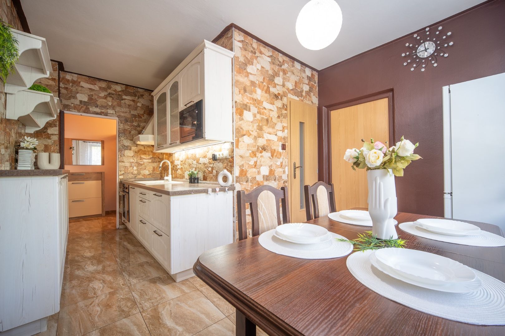 – vstupná chodba, detská izba, kuchyňa, samostatná toaleta, kúpeľňa s vaňou, technická miestnosť, špajza, obývacia miestnosť, spálňa
