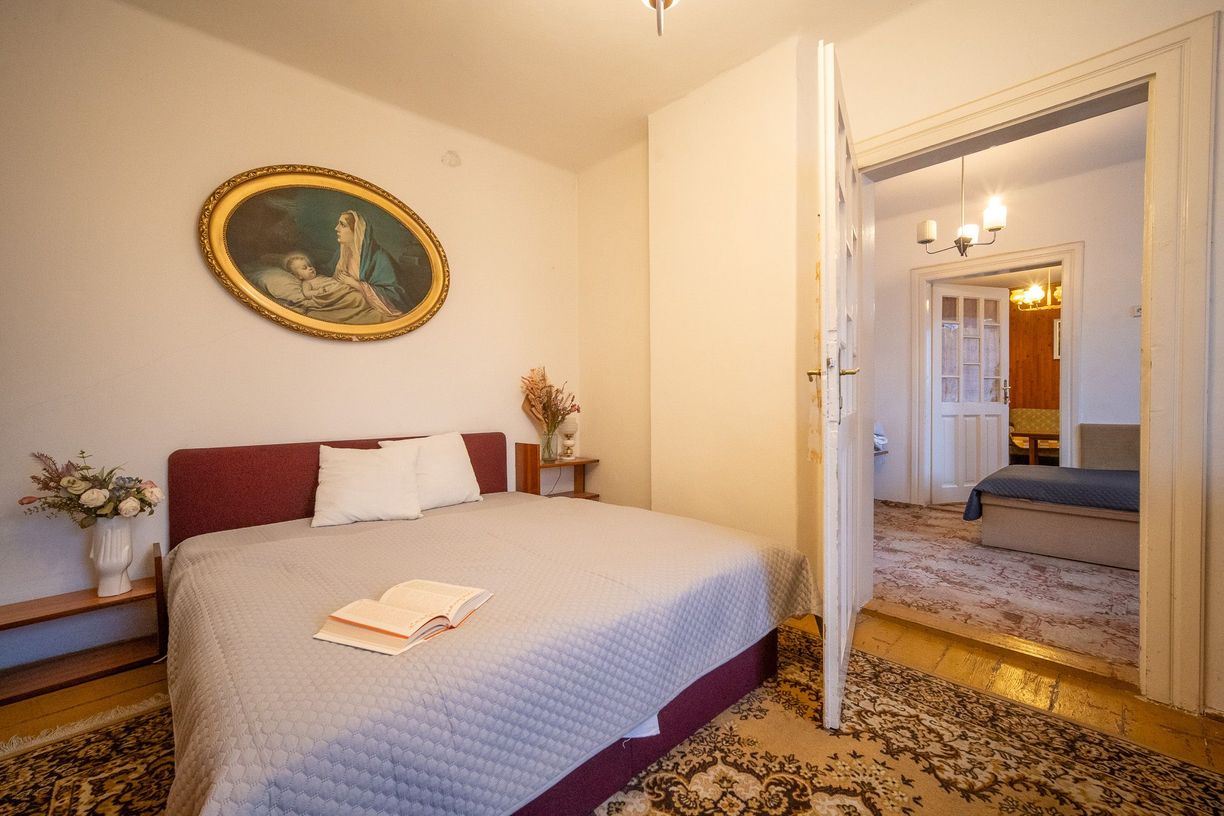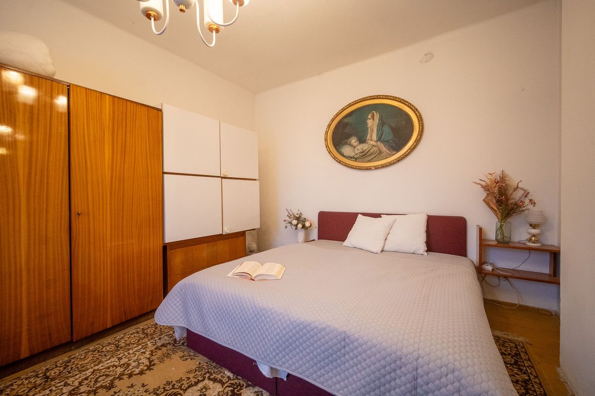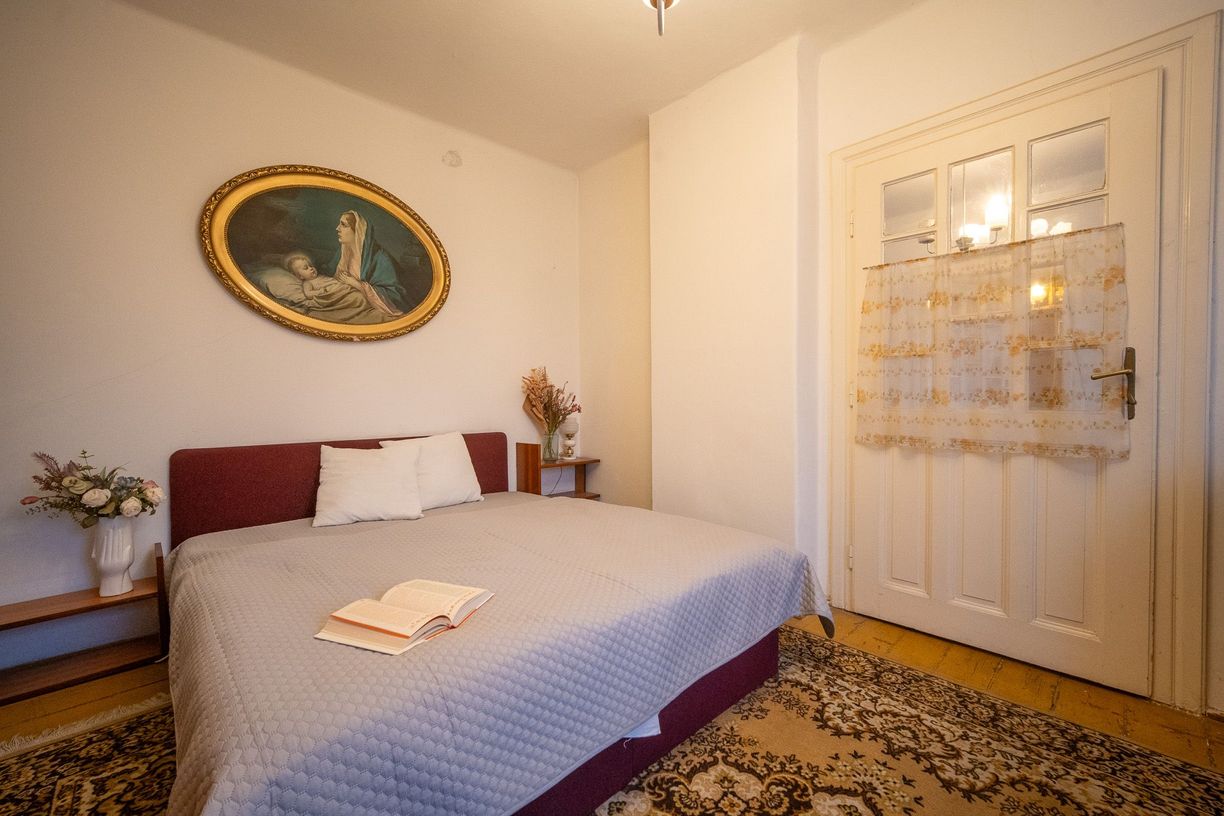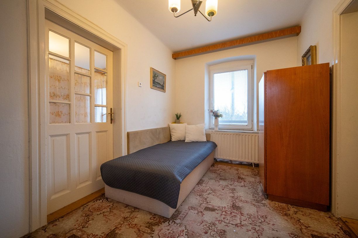 Na prízemí sa nachádza vstupná chodba a veľkorysý priestor, ktorý kedysi slúžil ako pekáreň. Vďaka svojej šírke a otvorenosti ponúka množstvo možností – od vytvorenia komfortnej dennej zóny až po ateliér či pracovňu. Súčasťou tejto časti je aj kuchyňa a kúpeľňa, čo zaručuje praktickosť každodenného fungovania.